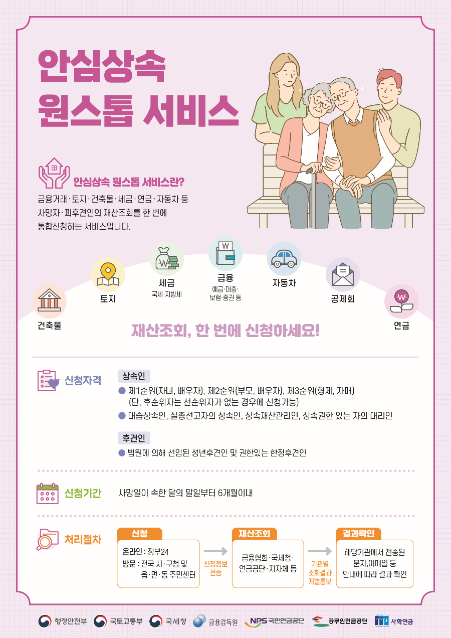 상속 전문 변호사나 세무사의 유튜브 동영상에서 한결같이 강조하는 행정서비스가 ‘안심상속 원스톱 서비스’이다. 2015년 행안부에서 주도하여 출시한, 망인의 자산과 채무를 편리하게 조회할 수 있는 서비스이다.