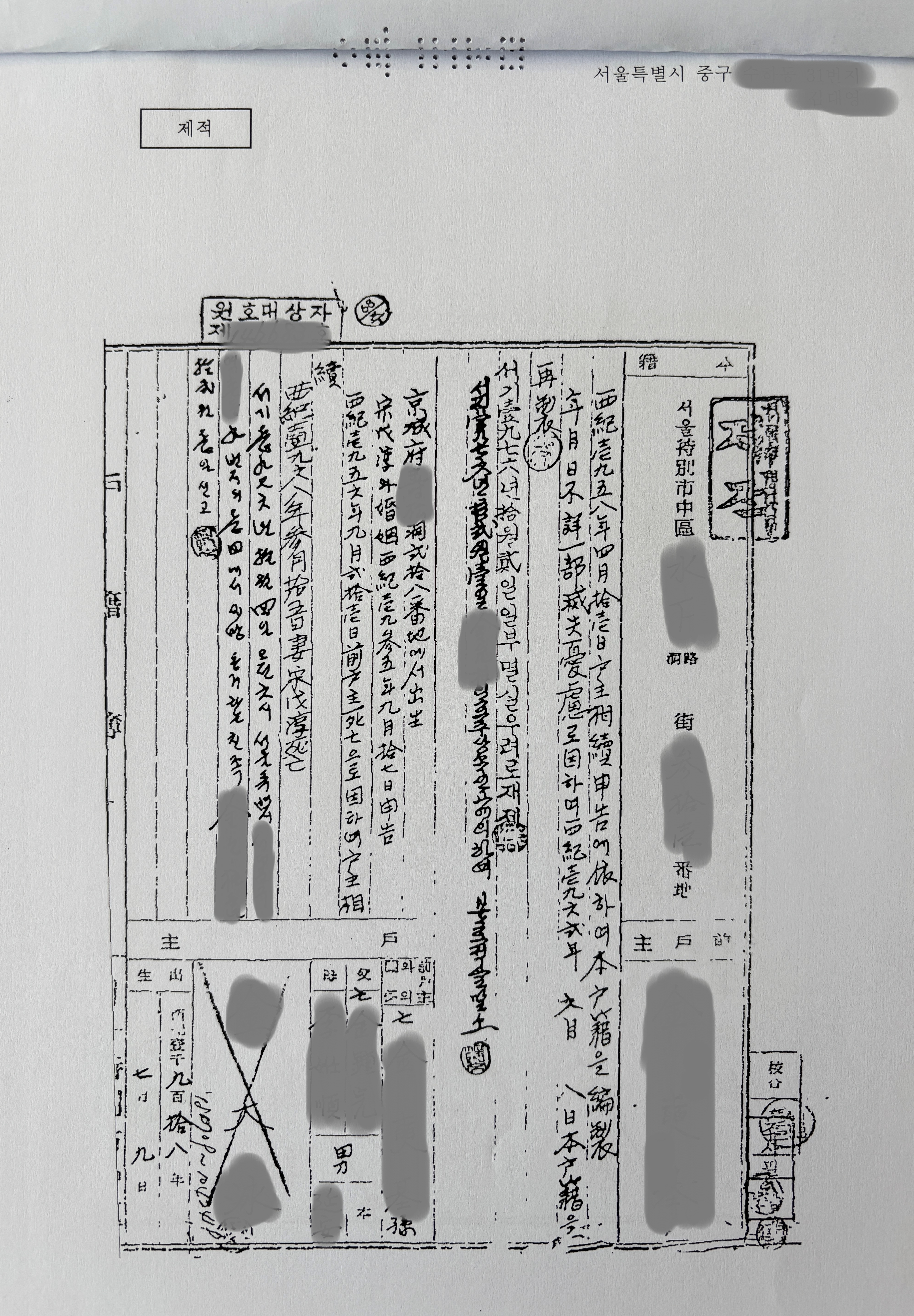 제적등본이라는 서류를 처음 봐서 매우 신기했다. 한자가 많고 손글씨라 알아보기는 꽤 어렵다. 일제시대에 기재된 부분은 서울시를 경성부(京城府)라고 써놨다. 숫자는 갖은자로 써있는데다 연도 표기도 서기가 아닌 단기라서 더 알아보기가 어려웠다. 서기로 고치려면 2333을 빼면 된다.