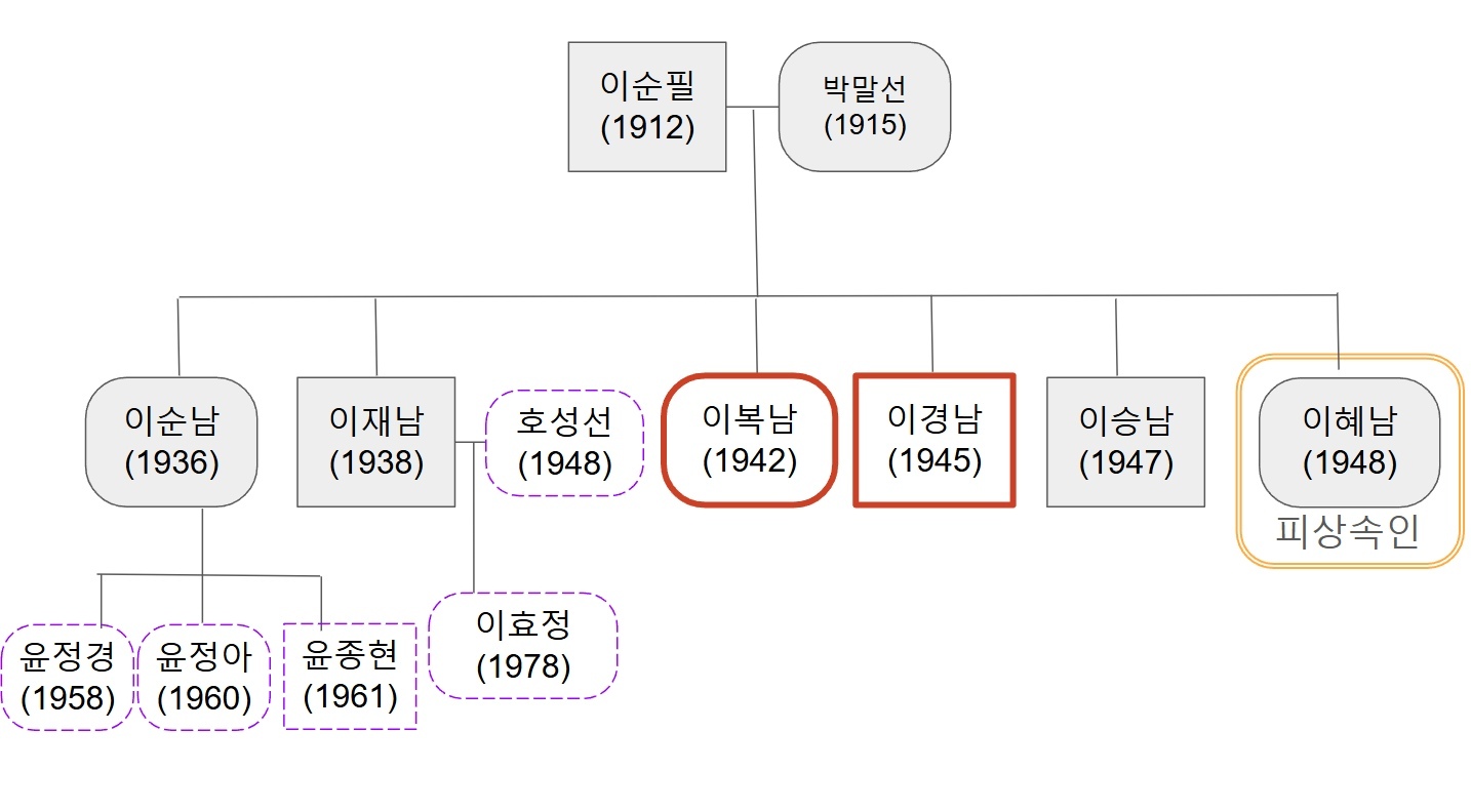 6남매 중 막내인 이혜남이 이번에 고인이 되신 분이다. 현재 생존한 형제자매는 망인의 언니인 이복남, 오빠 이경남 이렇게 두 사람이 있다. 이전에 이미 사망한 형제자매 3명 중 첫째와 둘째는 결혼하여 배우자와 자녀가 있으므로, 이들이 대습 상속인이 된다. 대습상속인들은 상속인이 받을 몫을 법정 상속비율에 따라 나눠 받는다. 셋째오빠인 이승남은 미혼으로 오래 전 사망하였기에 상속인이 되지 않는다.