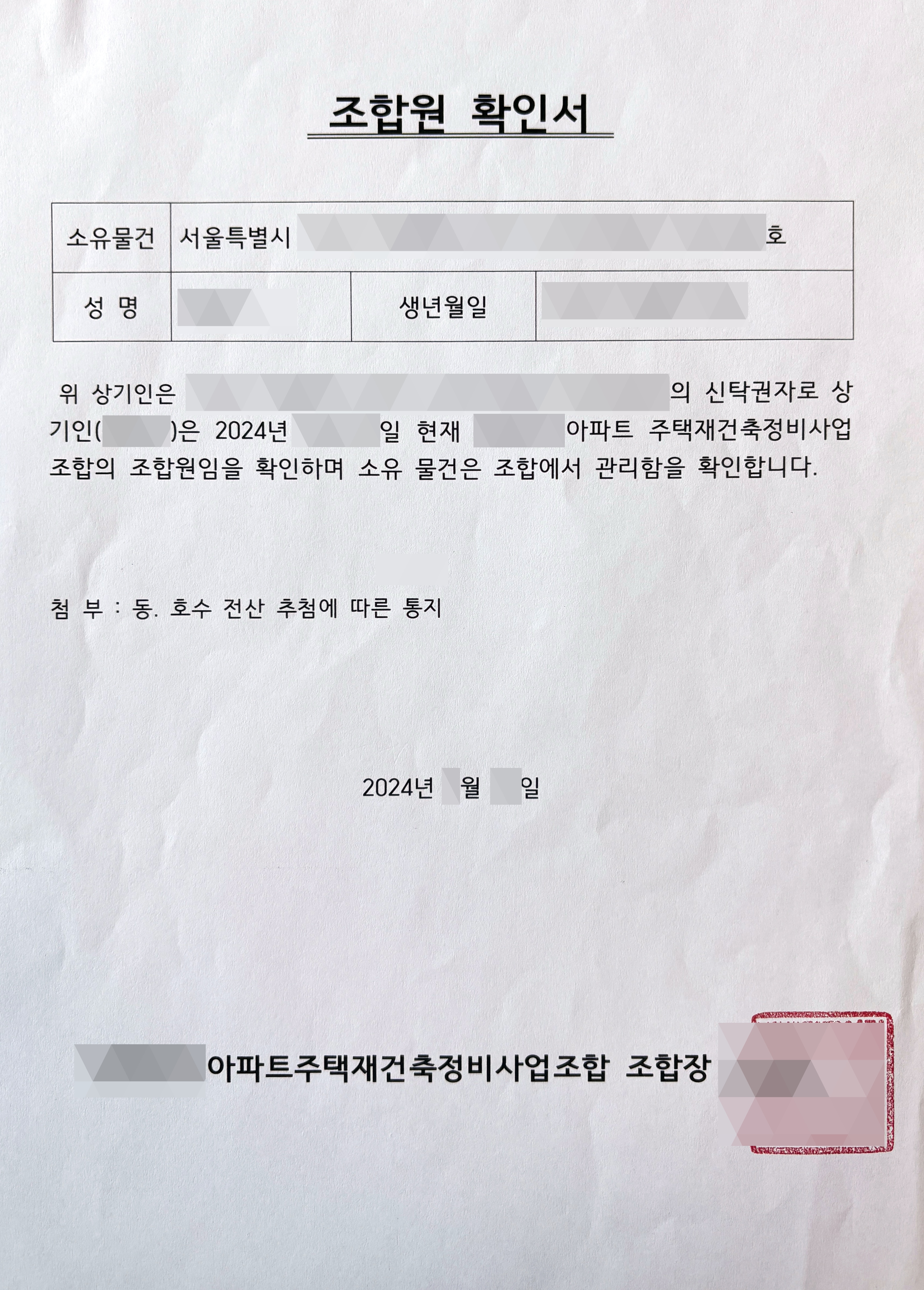 재건축 아파트 입주권이 하나 있는데, 이것을 입주권이라고 해야 할지 분양권이라 해야할지 잘 모르겠다. 80년대 분양받은 아파트이다. 이곳에 30년 넘게 거주하다가 재건축으로 철거 될 때 나와서 사쿠라 아파트를 구입하셨다. 현재는 재건축으로 인해 건물은 전부 멸실되고 토지 상태다. 따라서 재산권을 어떻게 증명해야 할지가 곤란했다.